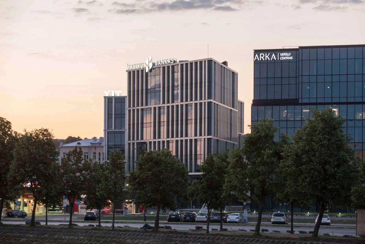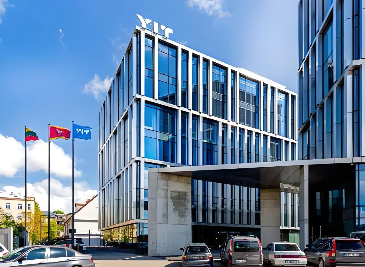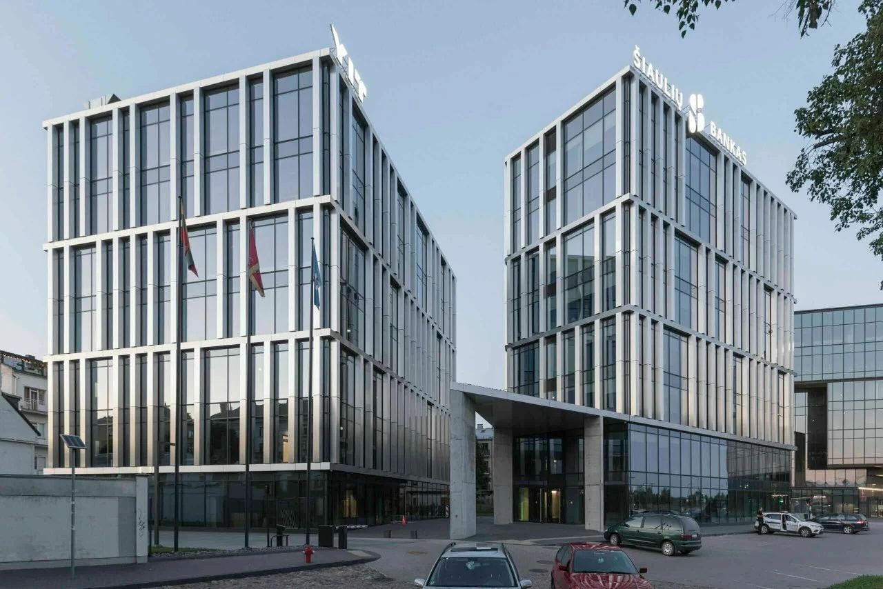 Due to the short winter sunshine hours in Lithuania, the architect covered both buildings with standard glass walls. In front of the glass wall, they set up pilasters covered with aluminum composite panels that mimic natural brushed stainless steel to construct the facade structure.