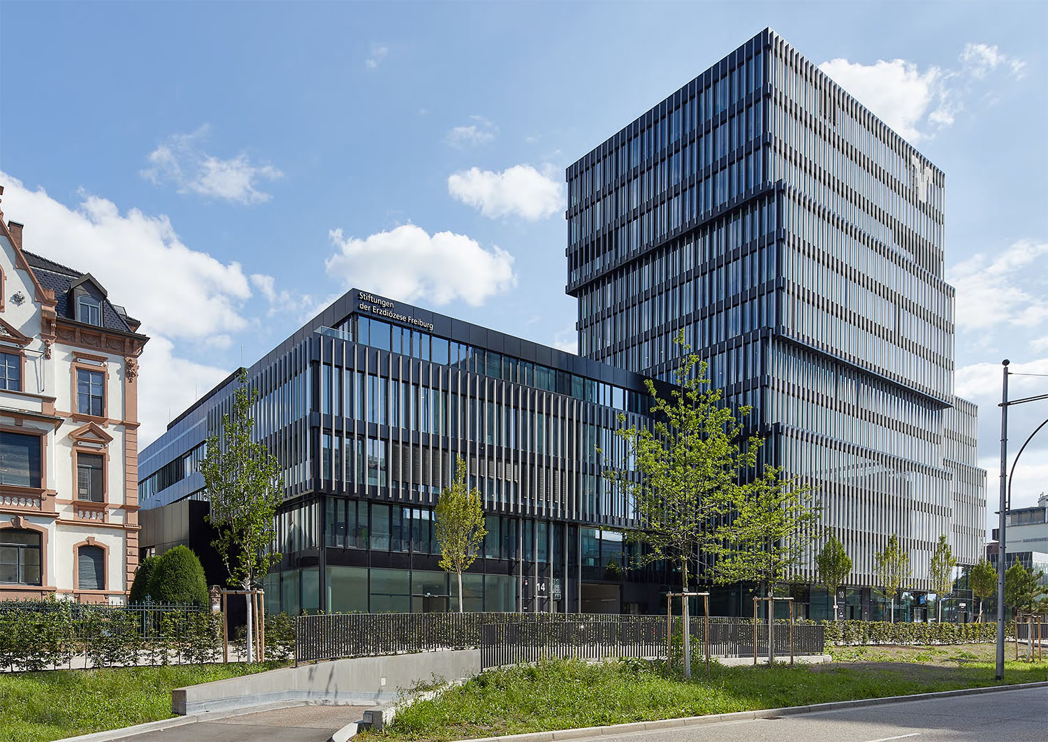 However, the architect believes that there are undeniable local elements embedded in it, as like the fir trees in the Black Forest, the light colored aluminum composite strips extend upwards into the sky against the background of the dark facade.