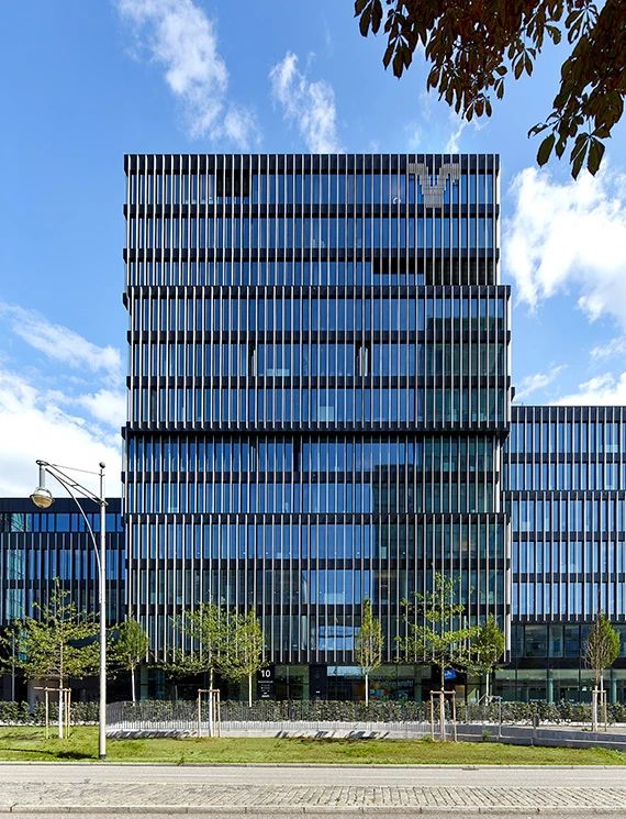 Finally, they covered the entire building complex with a unified facade. The dark toned strip shaped facade is made of glass and aluminum composite panels with a simulated anodized appearance and special colors. This effect is reminiscent of the classic international modernist style, like the American skyscraper designed by Mies van der Rohe, which is unrelated to any traditional South German style.