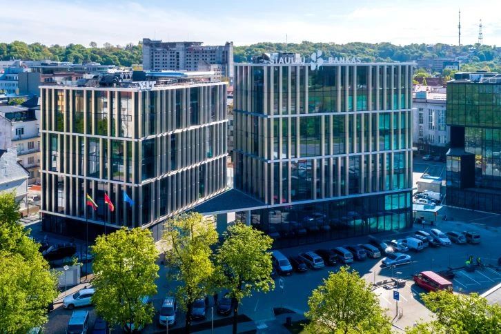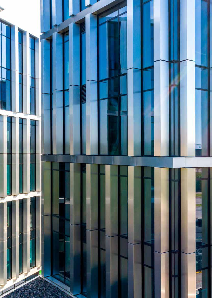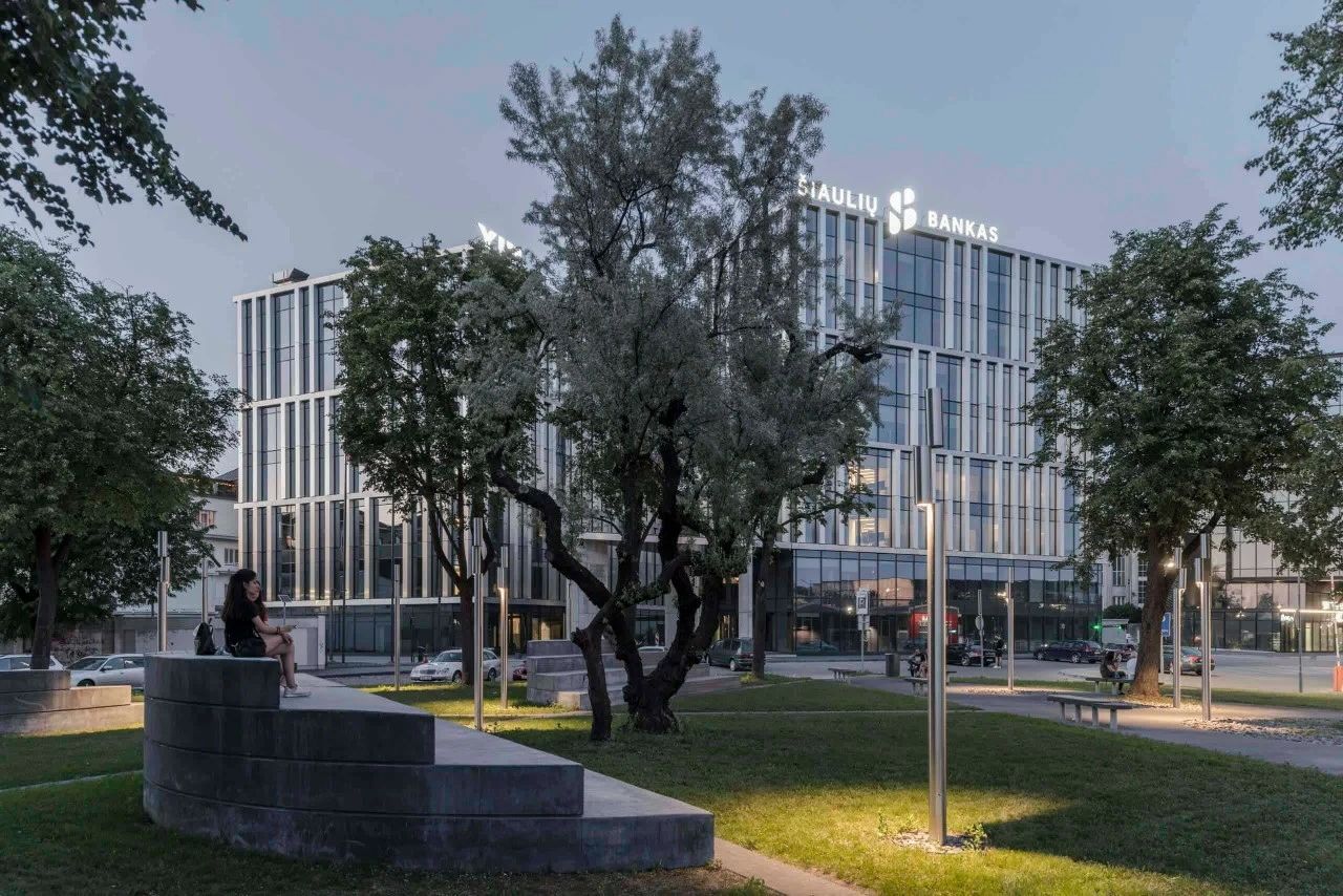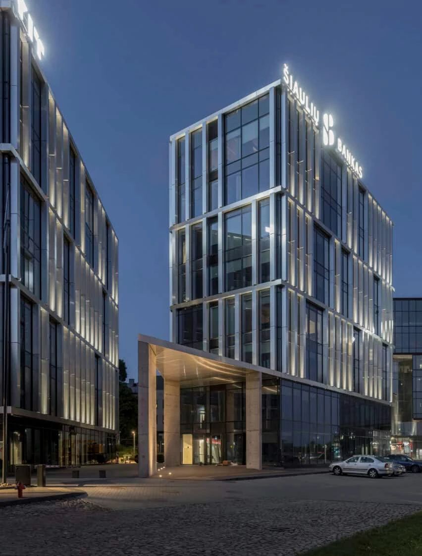 由于立陶宛的冬季日照时间短,建筑师为两栋建筑都覆盖了标准的玻璃墙。在玻璃墙前方他们设置了覆有仿不锈钢自然拉丝的铝复合板的壁柱,以构建立面结构。