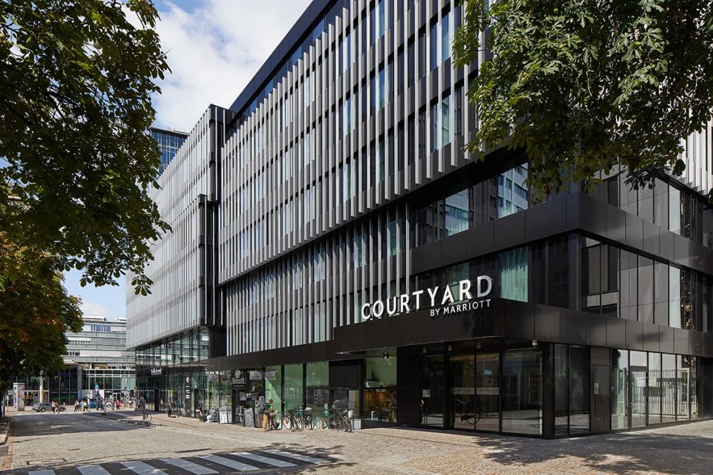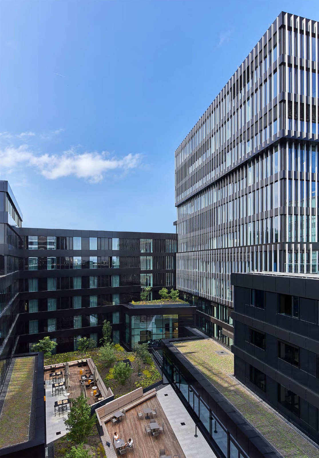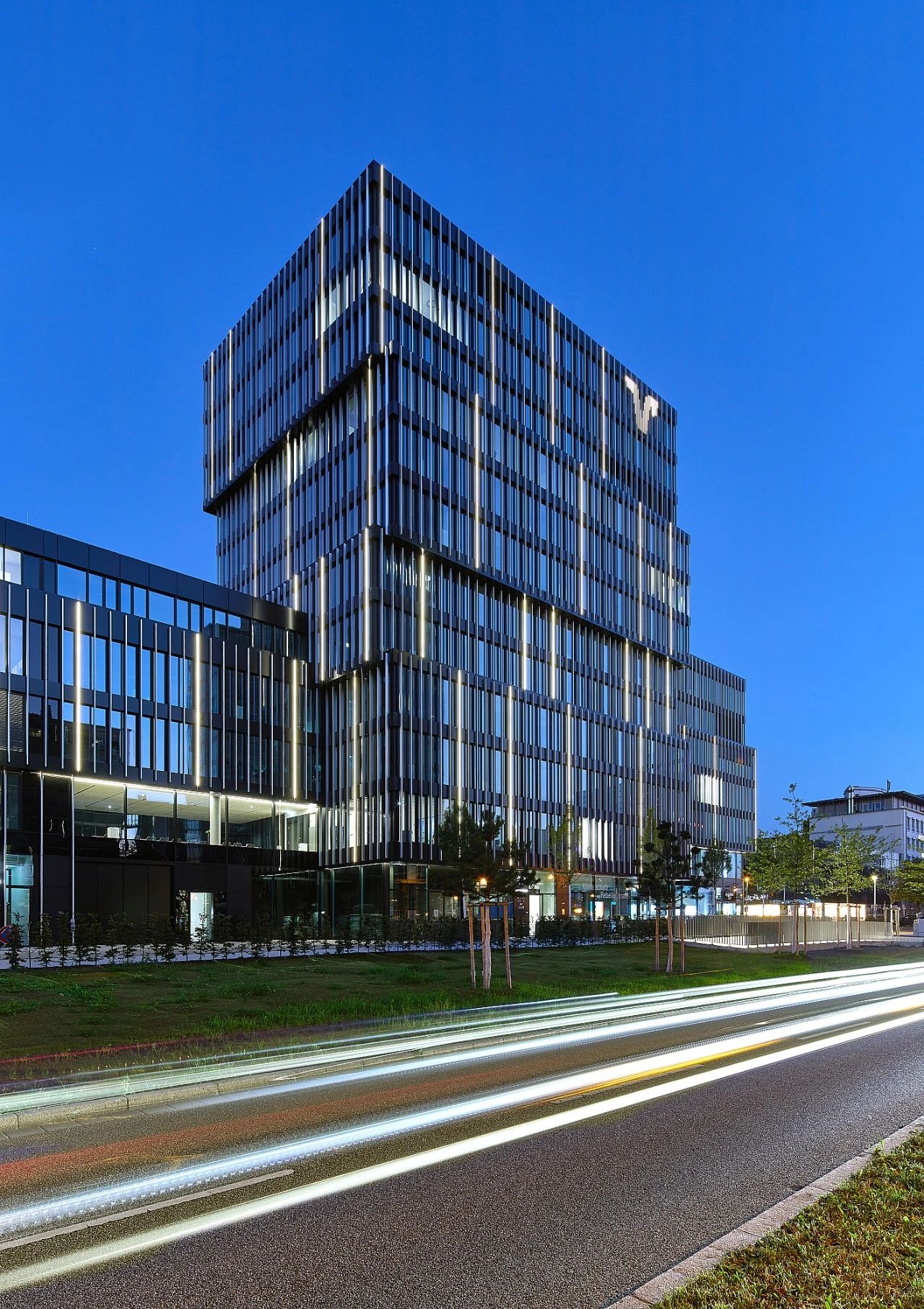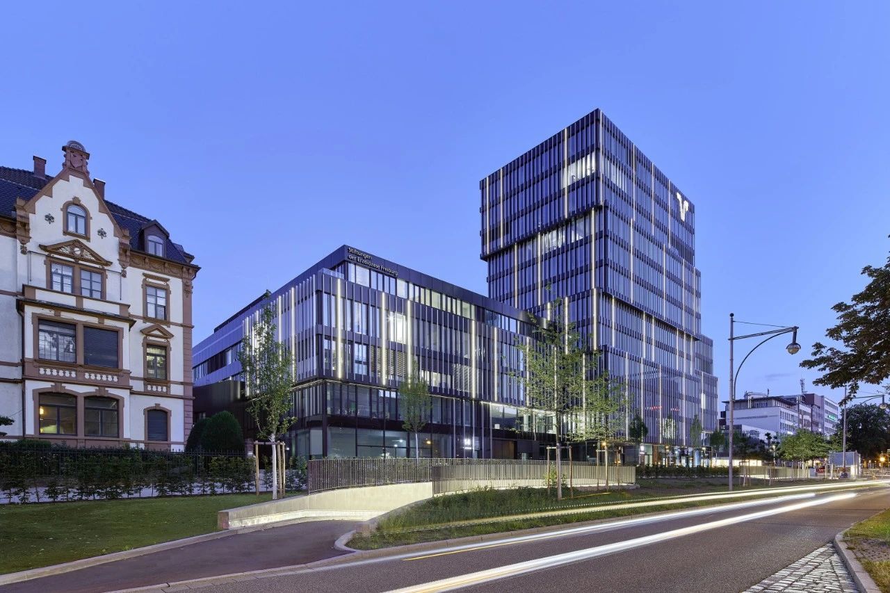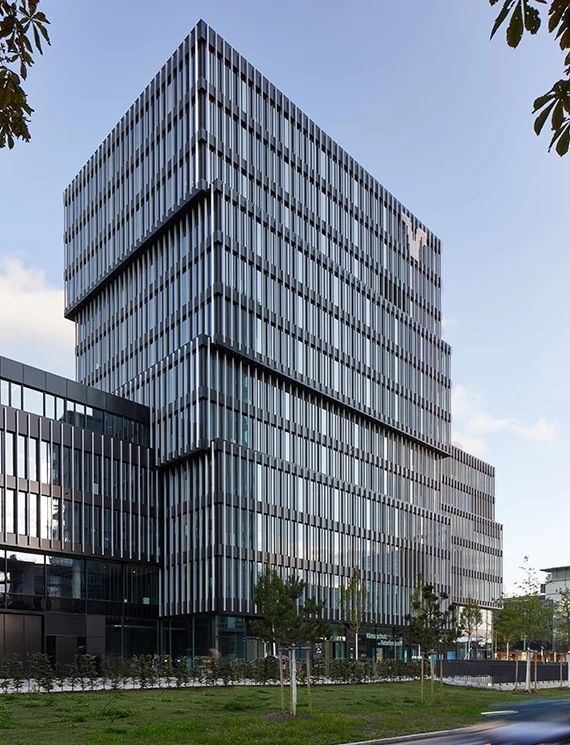 最后,他们为整个建筑群覆盖了统一的外立面。选用了深色调的带状外立面,由玻璃和仿阳极氧化外观及特殊颜色的铝复合板制成。这种效果让人联想到经典的国际现代主义风格,如同密斯·凡·德·罗设计的美国摩天大楼,与任何传统的南德风格都不相关。