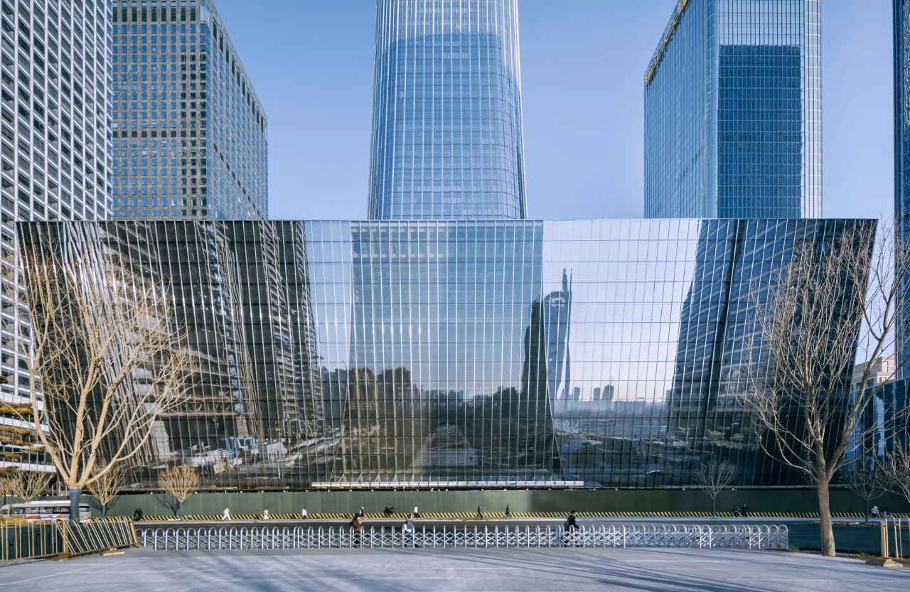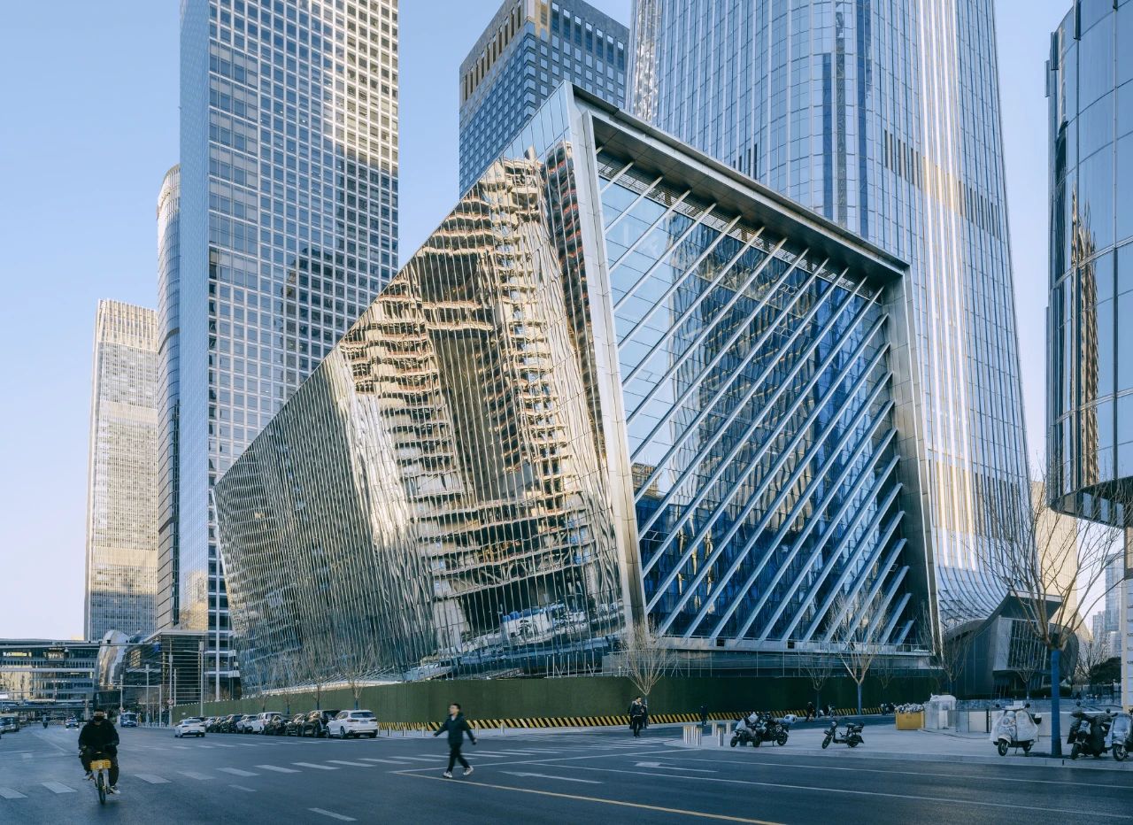 项目位于北京 CBD 主轴线中段,距天安门东侧仅五公里,南临中心公园,北望北京第一高楼 -- 中国尊。塔楼与绿地之间的过渡带,被赋予了极为克制的尺度限制 -- 建筑高度不得超过 41 米。在这片寸土寸金的区域,文化中心并未试图“比高",而是以“比轻”的策略,选择了城市对话而非视觉争夺。