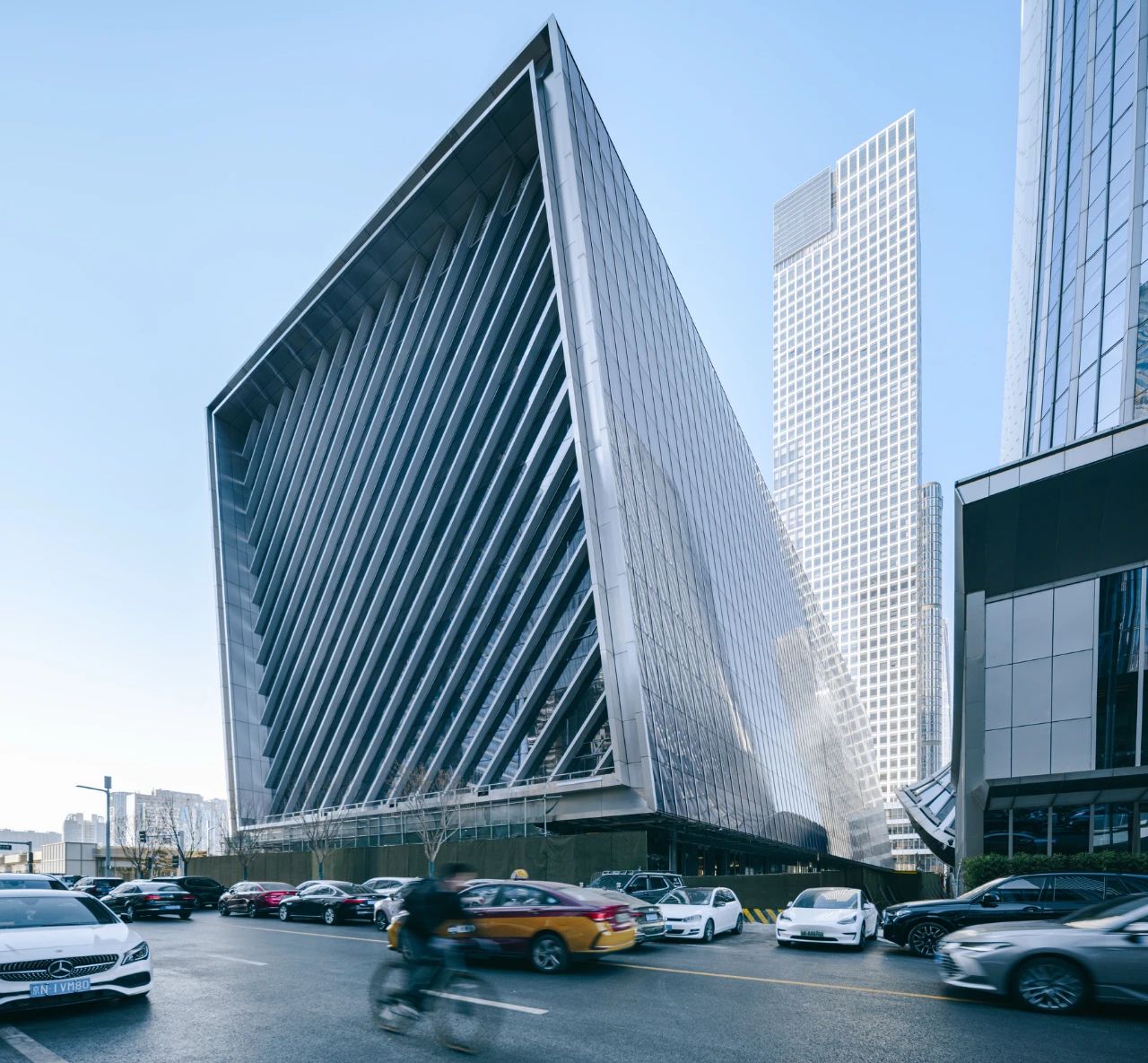 建筑由两座镜面“文化容器”构成,中间以通透的玻璃中庭串联,整体体量向南倾斜9度。这一设计策略,首先是在姿态上向南侧中央公园敞开,最大程度地将绿色景观纳入镜面立面之中。同时,这一角度亦有效避免了垂直幕墙常见的光污染问题一-通过倾斜设计,建筑将阳光反射控制在可接受范围内,降低了对周边建筑的干扰,使其成为城市肌理中的温和参与者。