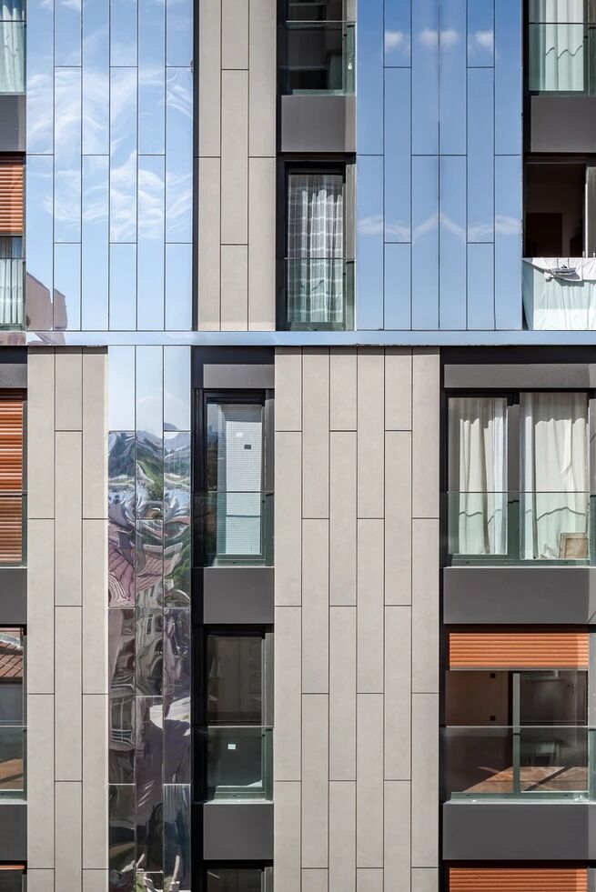 外立面选用了能映射天空的镜面铝复合板,以及质地轻盈、兼具石材质感的卡勒烧结柔性板。为平衡十四层建筑的高度感,每三层会用横向的镜面铝复合板对垂直面板进行分隔。
