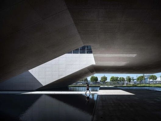 大面积镜面水池在超尺度悬挑建筑结合,入口处的设计去繁就简,只保留了一条浮于水面的丁字形步道。